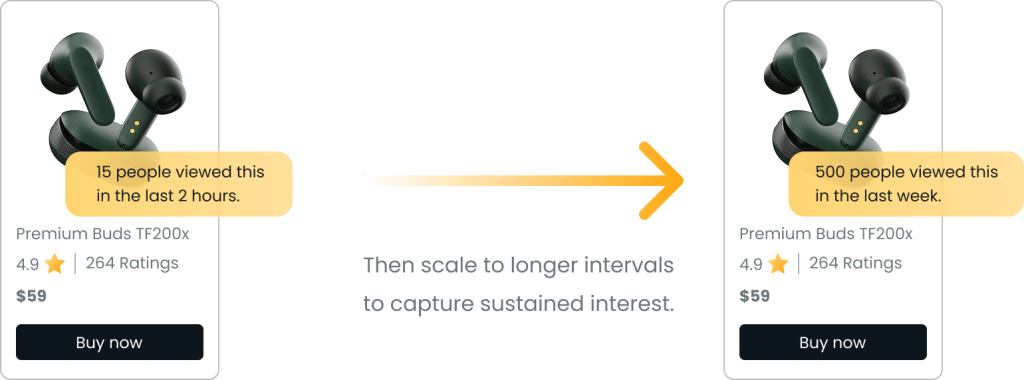 Notice how coverage grows with longer intervals and lower thresholds. This flexibility helps tailor social proof messaging solutions to different business realities — from the urgency of flash sales to sustained interest in core categories.