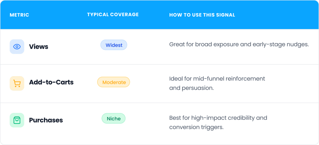 Each metric highlights a different level of shopper intent, and layering the right credibility cues on top makes your social proof strategy both persuasive and balanced.