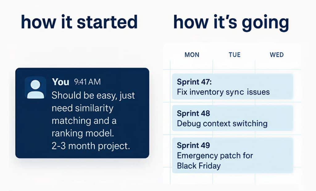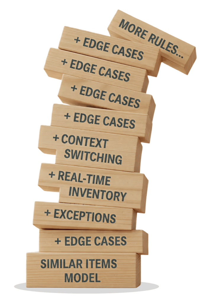 None of this sounds crazy. This is just retail. But each request chips away at your simple system–until that original “similar items” model is doing maybe 5% of the actual work.