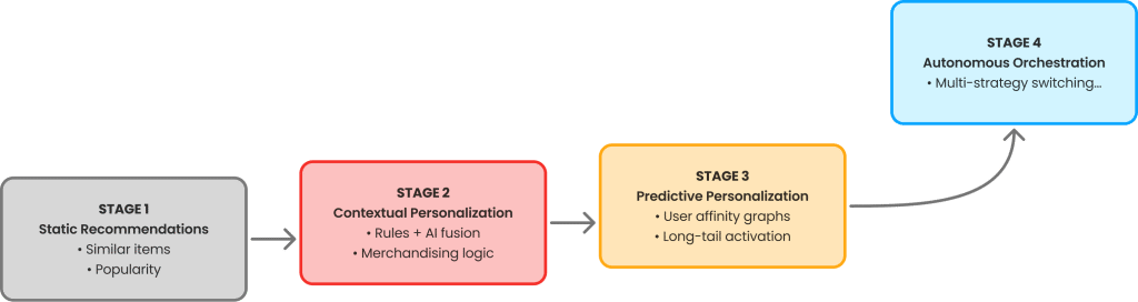 Stage 1 strategies (similarity, popularity, basic cross-sell) can be incredibly effective early on. They capture high-intent, obvious behavior really well. But they tap out around 60-120 days because they’re reactive, not predictive. They show what people already want, not what they might want.